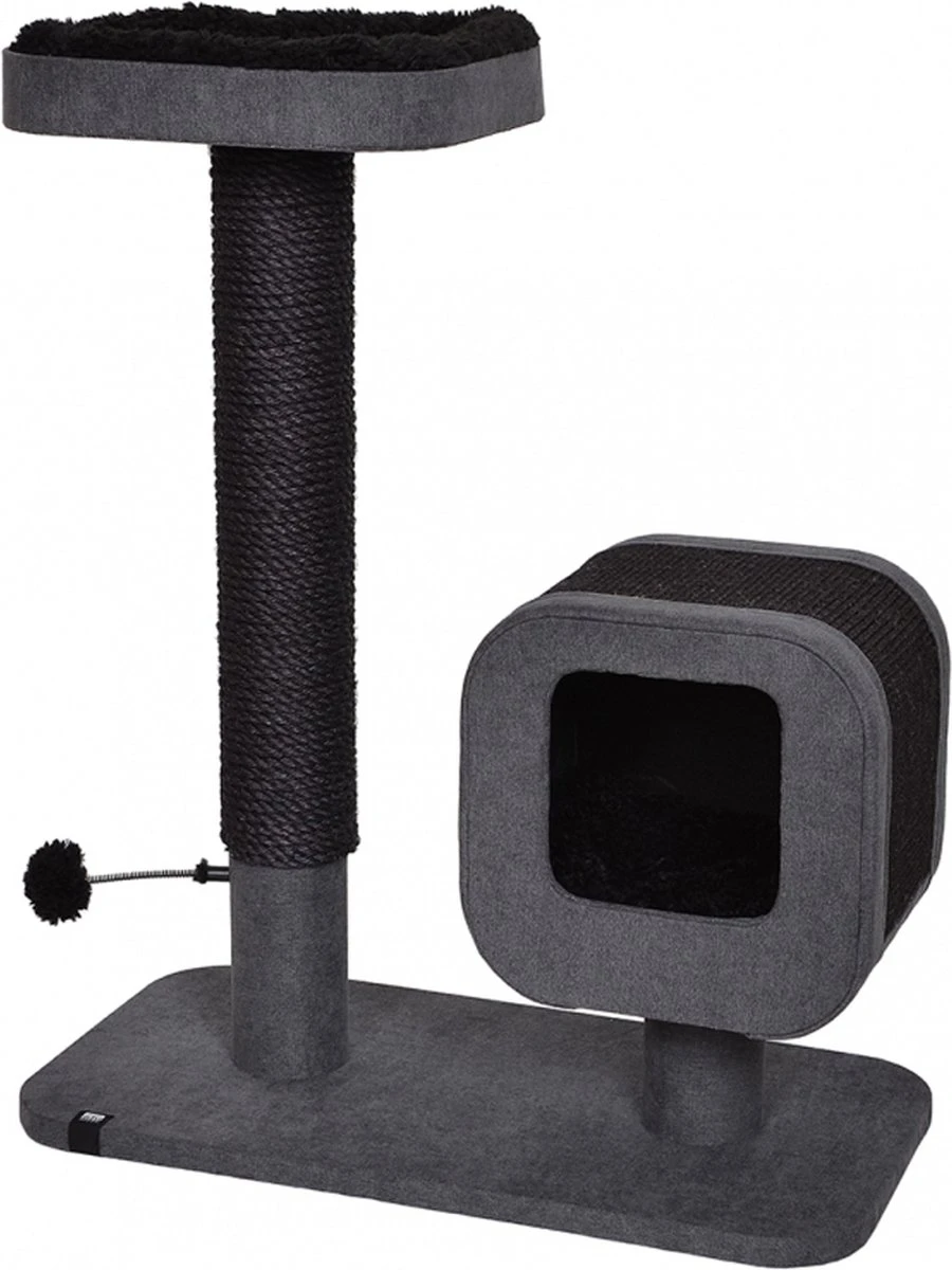 De krabpaal Nagoya grijs is een luxe design krabpaal! Hierdoor staat hij prachtig in een modern interieur. Deze krabpaal is geïnspireerd door het Japanse zen-concept. In Japan draait dit concept om rust en eenvoud en dat is terug te vinden in deze krabpaal. Dit esthetische model geeft namelijk kalmte en minimalisme weer en dat zorgt voor een zen gevoel. Daarnaast is deze krabpaal ook nog eens compact en daarom zeer geschikt voor een kitten of kleine kat. Door zijn compacte vorm is deze stijlvolle krabpaal geschikt om op veel plekken in huis neer te zetten. Er is ook gedacht aan het nodige comfort voor jouw kat, want de krabpaal is bekleed met een zachte interieurstof. Op de het onderste plateau zit een kattenhuisje waar jouw kat heerlijk in kan liggen om te ontspannen of om te slapen. Het kattenhuis is voorzien van een kussen in teddyvacht, waardoor het huisje ook nog eens zeer comfortabel is voor jouw kat. Op het onderste plateau rust een paal van sisal, waar jouw kat heerlijk aan kan krabben. Dit is erg belangrijk, want door het krabben onderhouden katten hun nagels en bakenen ze territorium af. Bovenop deze sisalpaal zit een platform met een zacht kussen van teddyvacht. Hier kan jouw kat lekker ontspannen of de boel in de gaten houden. Onderaan deze paal zit nog een balletje aan een springveer bevestigd, waar jouw kat heerlijk mee kan spelen.
