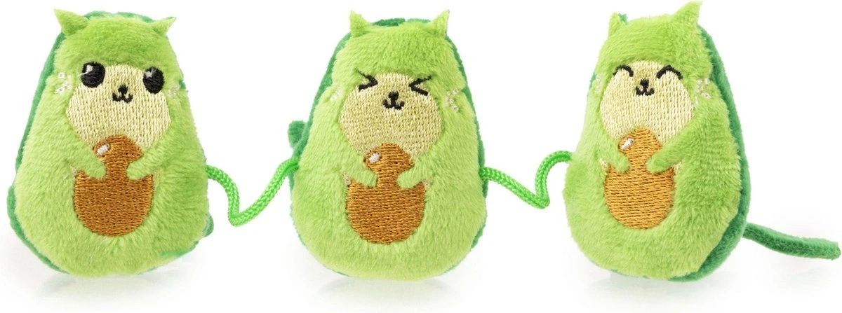 Een touw met daaraan drie Avocato’s van het merk FuzzYard, het meest modieuze speelgoed!