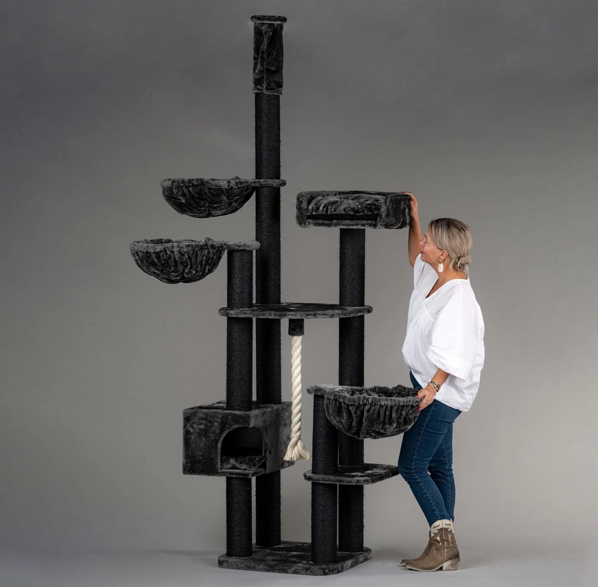 Krabpaal voor grote katten Catdream de Luxe Blackline Dark Grey met 54KG is een van de stevigste krabpalen in de markt, door de meest stabiele opbouw met 4 cm dikke bodemplaat en 4 dikke 12 cm sisalpalen die naar boven gaan.