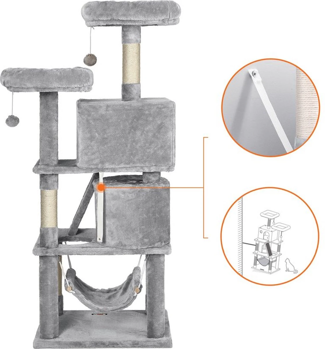 Dit is geen droom. 2 knuffelgrotten, 2 uitkijkplatforms, 1 hangmat, met klimgat en krabplank – deze krabpaal (60 x 50 x 155 cm) wordt je nieuwe thuis!