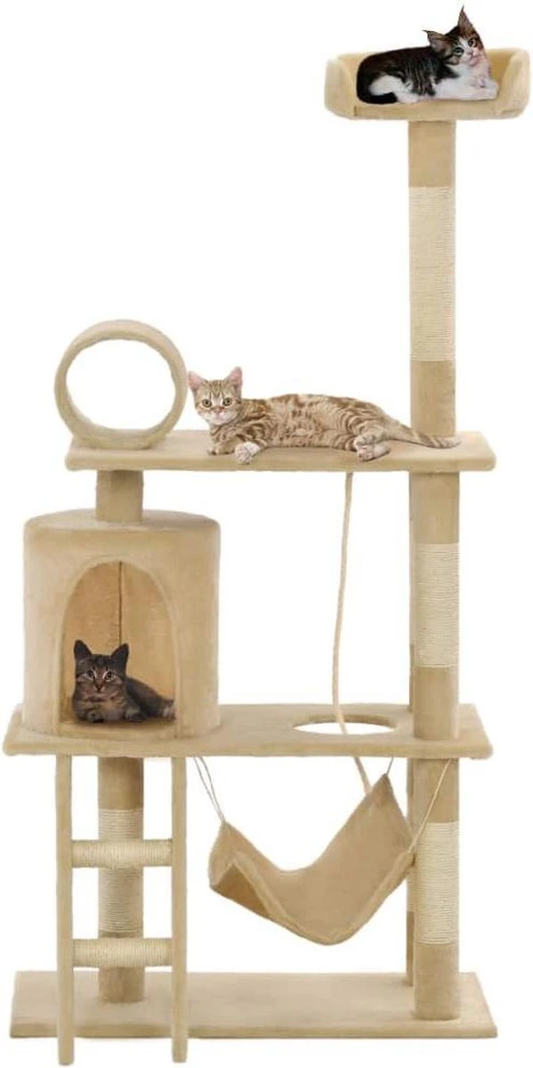 De pluche, bedekte krabpalen zijn gewikkeld in sisaltouw, wat zeer comfortabel en handig is voor je kattenvriend om zijn klauwen scherp te houden. Je katten zullen het leuk vinden om achter elkaar aan te rennen terwijl ze op en neer springen op dit leuke speelcentrum. Onze kattenkrabpaal is ontworpen met een gezellig huis waar je kat een dutje kan doen of kan ontspannen. Hij heeft een hangmat, een ladder, een klimtouw, uitkijkplatformen en ontspanningsruimtes om je kleine vriend te vermaken. De basis van deze kattenkrabboom is stevig en stabiel.